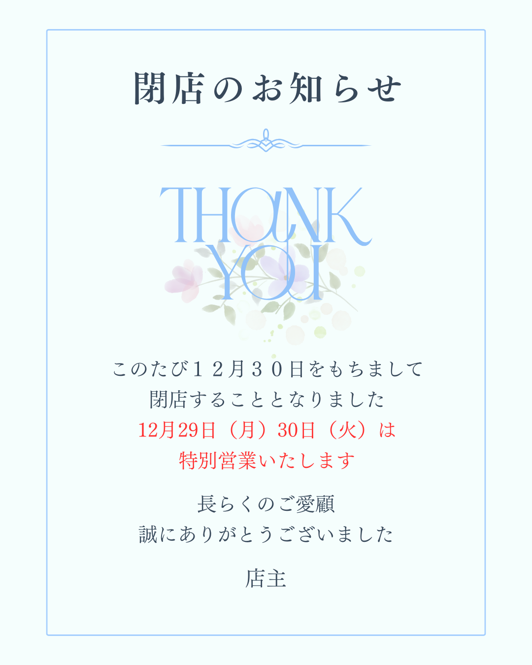 突然のご報告となりますが、12月30日(火)をもちまして閉店させていただくこととなりました。